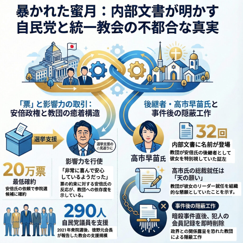高市氏の問題を理解するためには、まず安倍元首相と統一教会の関係が、単なる思想的共鳴などではなく、選挙における「票」と政治的影響力を交換する、極めて実践的な「取引関係」であったことを把握する必要がある。この強固な癒着構造こそが、全ての背景となっているからだ。