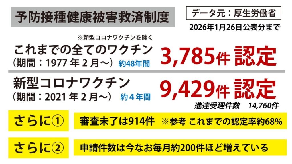 厚生労働省の公式ページでは、審査結果が随時更新されており、1月26日の第191回審査分科会でも関連資料が公開されています。認定率は全体の約68%前後とされ、否認・保留も相当数存在しますが、被害申請者の救済を求める声は根強く続いています。