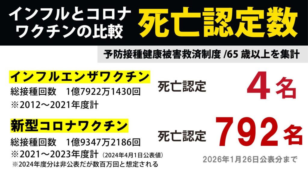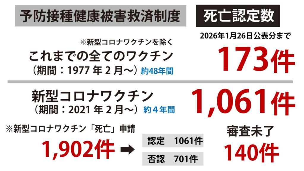 厚生労働省の疾病・障害認定審査会(感染症・予防接種審査分科会)によると、新型コロナワクチン接種後の予防接種健康被害救済制度における認定数は9,429件(1月26日時点)。うち死亡認定は1,061名に上ります。この数字は、1月26日の審議で新たに8件(うち死亡1名)が認定された結果です。藤江氏の投稿では、これを「空前絶後の健康被害認定数」と強調し、過去の政治家発言との対比を指摘しています。