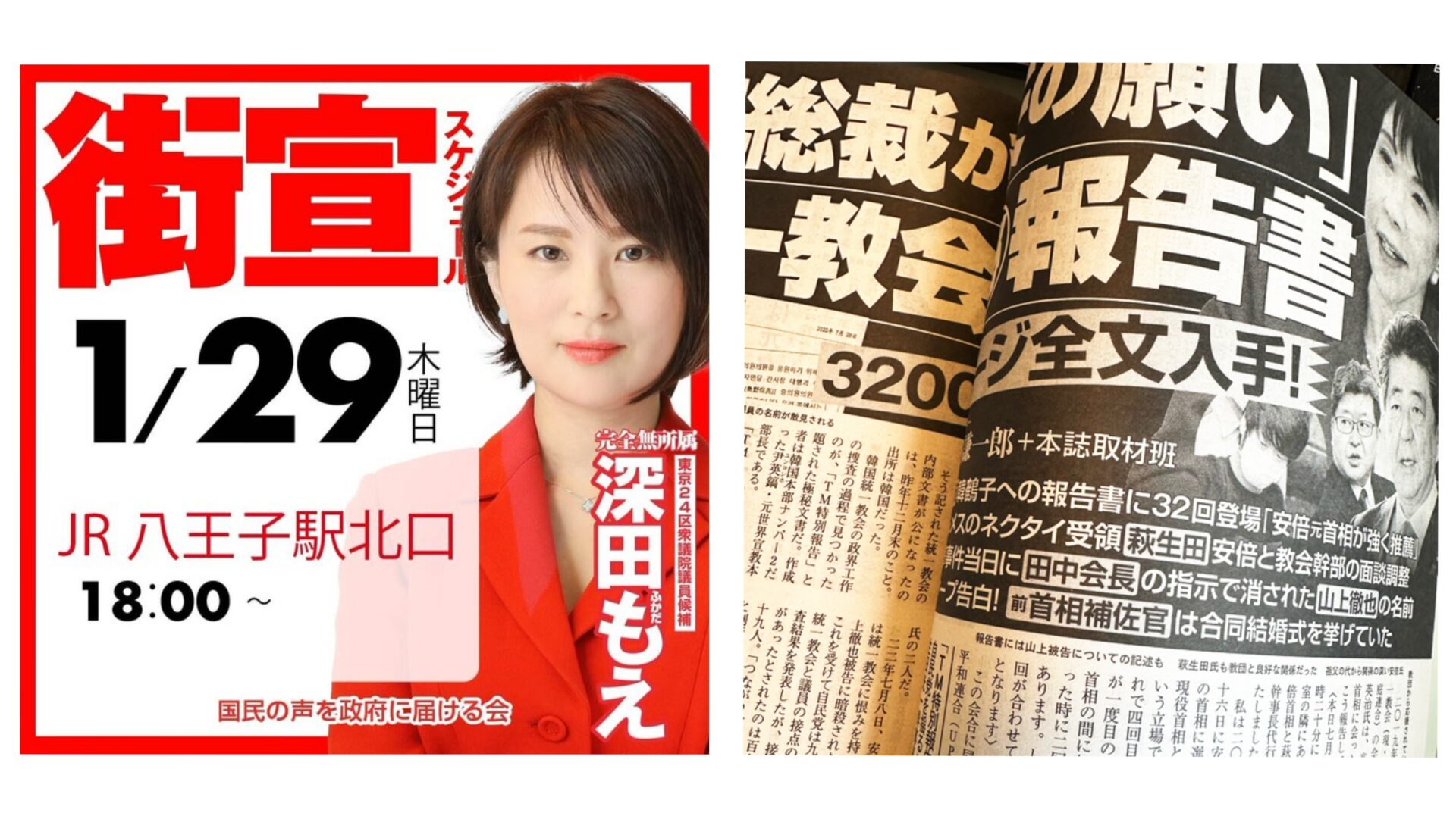 そんな深田氏が、1月29日(木曜日)18時から、JR八王子駅北口で緊急街頭演説を行うことが明らかになった。深田氏は炎のように赤い選挙用のポスター画像で告知している。ポスターには深田氏のポートレートが大きく配置され、赤を基調としたデザインで緊急性を強調。演説では、東京24区の萩生田光一氏(自民党)への批判を中心に、裏金問題、媚中疑惑、統一教会とのつながりなどを取り上げる見込みか?
