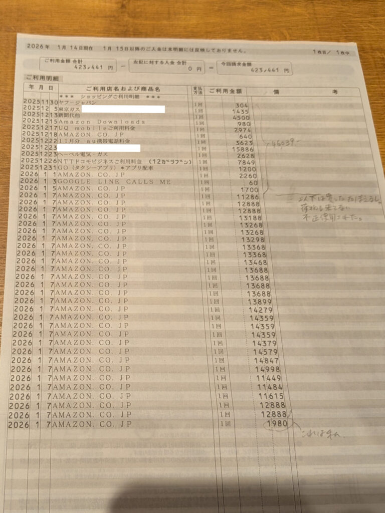 クレジットカードの明細には、1ページを埋め尽くさんばかりの「AMAZON.CO.JP」の文字が並びます。攻撃者は発覚を恐れるどころか、アカウントの権限を握っている間に、可能な限りの決済を詰め込むという「強奪」に近い立ち回りを見せました。