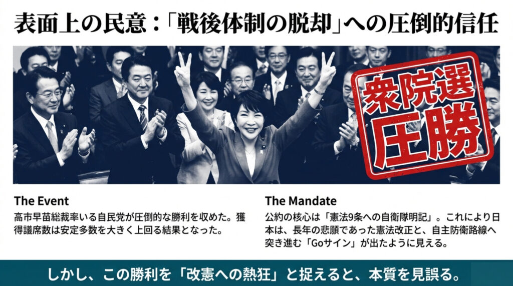 2026年2月、極寒の中で行われた衆議院議員総選挙は、高市早苗総裁率いる自民党の圧倒的な勝利という幕切れを迎えました。憲法9条への自衛隊明記を旗印に掲げた政権が大勝したことで、日本はついに「戦後体制からの脱却」へと舵を切ったかのように見えます。