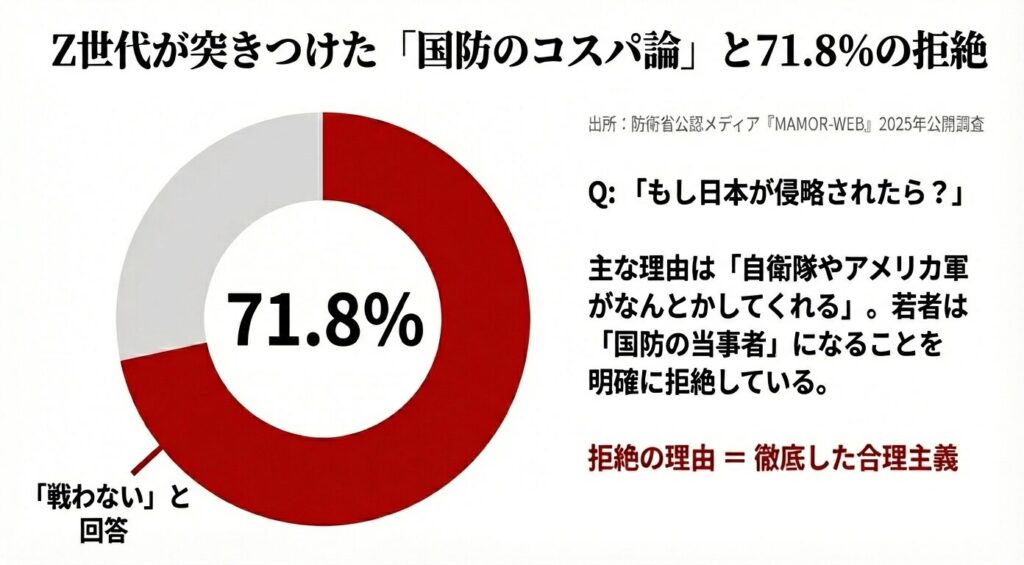 今回の選挙結果を振り返る上で、避けて通れないデータがありました。2025年に防衛省公認メディア『MAMOR-WEB』が発表したアンケート調査結果です。これによると、Z世代の実に71.8%が、日本が侵略された際にも「戦わない」と回答しました。