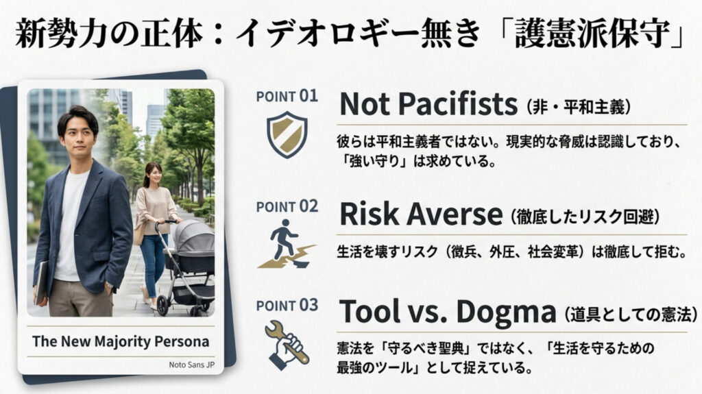 彼らが目指すのは、憲法という強固な防備をあえて維持したまま、その枠内で「食糧安保」や「エネルギー自律」などを完遂するという「守りのリアリズム」です。憲法を「変える対象」ではなく、外圧から家庭や子供、そして自分たちの限られた生活を守り抜くための「最強のツール」として捉え直す勢力です。