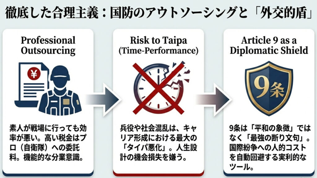 • 専門家へのアウトソーシング(分業意識) 「高い税金を払っているのだから、国防はプロ(自衛隊)が完遂すべきサービスである」という顧客視点。素人が戦場へ行くことの非効率性を、コスト面からロジカルに判断して拒絶しています。