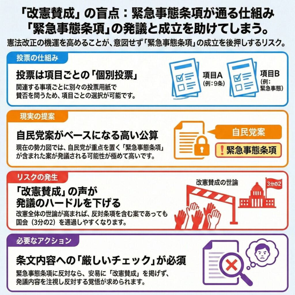 「他党の穏当な案が採用されるかもしれない」という期待は、現在の政治力学の前では空理空論に過ぎません。衆議院で3分の2超を確保している自民・維新などの勢力図を考えれば、野党や他党の独自案が最終的な発議案に反映されるハードルは極めて高く(事実上、不可能に近い)、実際に私たちの手元に届く投票用紙は、自民党の重点項目である「緊急事態条項」がベースとなる公算が極めて大きいのが現実です。