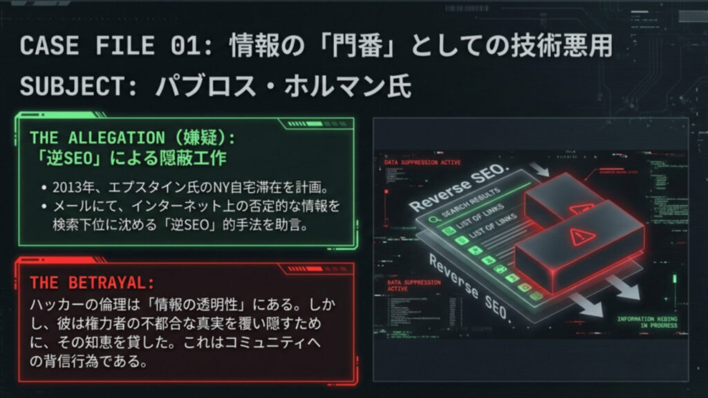 特に衝撃的なのは、パブロス・ホルマン氏の関与だ。2013年にエプスタイン氏のニューヨークの自宅に滞在する計画を立てていただけでなく、インターネット上の否定的な情報を検索結果の下位に押し下げる、いわゆる「逆SEO」的な手法を助言していたことがメールから判明した。情報の透明性を重視すべきハッカーが、権力者の不都合な真実を覆い隠すための「情報の門番」として知恵を貸していたという事実は、コミュニティへの重大な裏切りに他ならない。