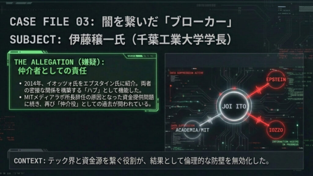 このスキャンダルは、日本の教育・研究機関のガバナンスにも鋭い刃を突きつけている。リストには千葉工業大学学長の日本人、伊藤穰一氏の名前が記載されていたのだ。