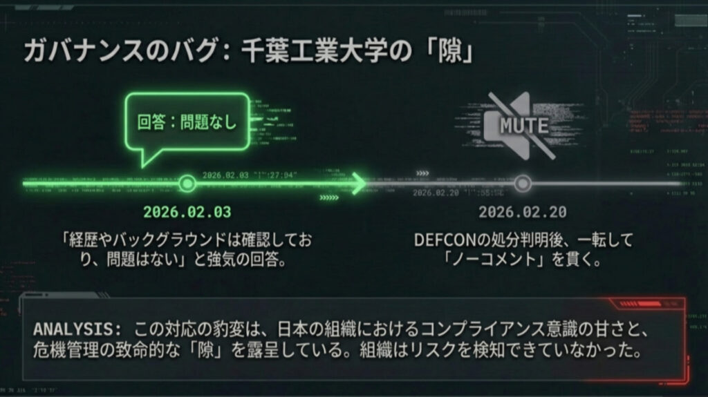 注目すべきは、伊藤氏が学長を務める千葉工業大学の対応の変化だ。2月3日時点、同大は伊藤氏の学長就任時の経緯について「経歴やバックグラウンドは確認しており、問題はない」と強気な回答をしていた。しかし、DEFCONによる追放処分が明らかになった後の2月20日には、一転して「ノーコメント」を貫いている。この豹変は、組織の危機管理における決定的な「隙」と、日本の大学組織におけるコンプライアンス意識の甘さを露呈している。