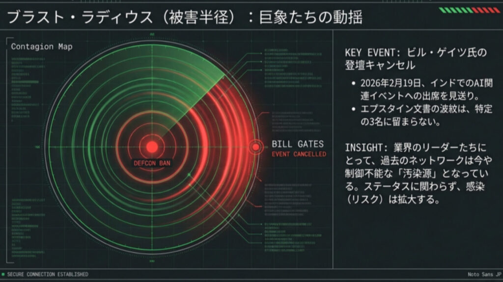 この問題は、特定の3名の追放に留まらない。マイクロソフトの創業者で有名なテック界の巨人、ビル・ゲイツ氏もまた、この「エプスタイン文書」の波紋を避けられず、2月19日に予定されていたインドでのAI関連イベントへの登壇を見送った。