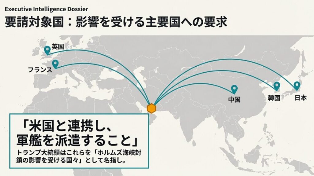 トランプ米大統領は3月14日、自身のSNSで日本、中国、韓国、フランス、英国などに対し、軍艦の派遣を強く要求した。「ホルムズ海峡封鎖の影響を受ける国々は、米国と連携して軍艦を送るべきだ」とし、これらの国を「受益者」として名指し。敵対関係にある中国さえ巻き込む異例の「受益者負担」論を展開した。
