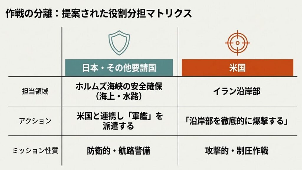 トランプ氏の構想では、日本などの有志国が海上で「安全確保」(盾)を担い、その間に米国が沿岸部を「徹底爆撃」(矛)するという役割分担。日本にとっては、専守防衛の原則を揺るがす「血のコスト」を伴う選択を迫られている事態だ。