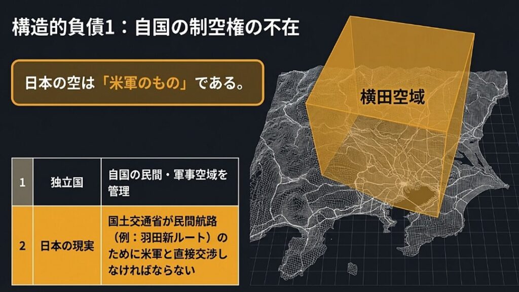 - 空域権の放棄: 日本の空の権利は米軍(米国政府ではなく米軍)が握っており、国交省は独自の判断で成田や羽田の航路を決められません(横田空域)。