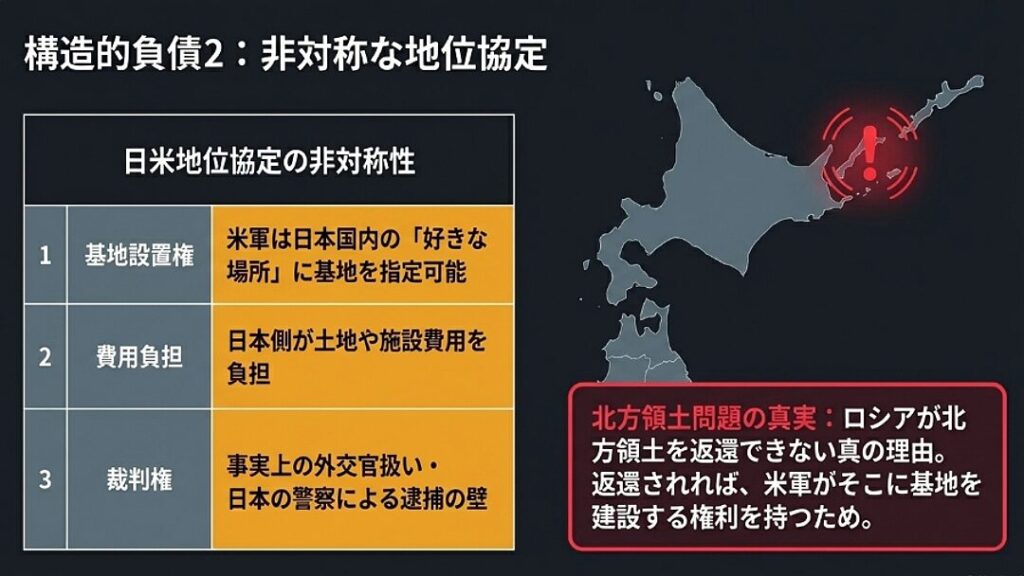 - 日米地位協定: 米軍が希望すれば国内のどこにでも基地を設置でき、その費用を日本が負担する。米軍には事実上の外交官特権が与えられています。