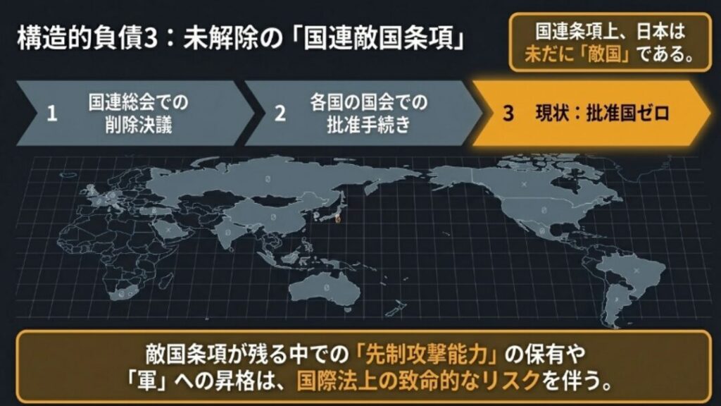 - 国連敵国条項: 国連憲章にいまだ残る、日本を「敵」と見なす条項。