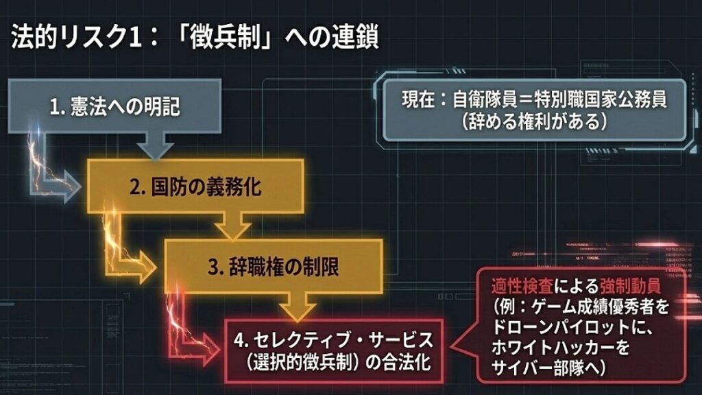 ここで懸念されるのが、米国の「セレクティブ・サービス(選抜徴兵対象登録)」に近い仕組みの導入です。これは単に銃を持たせる「国民皆兵」ではなく、特定のスキルを持つ若者をピンポイントで動員するシステムです。