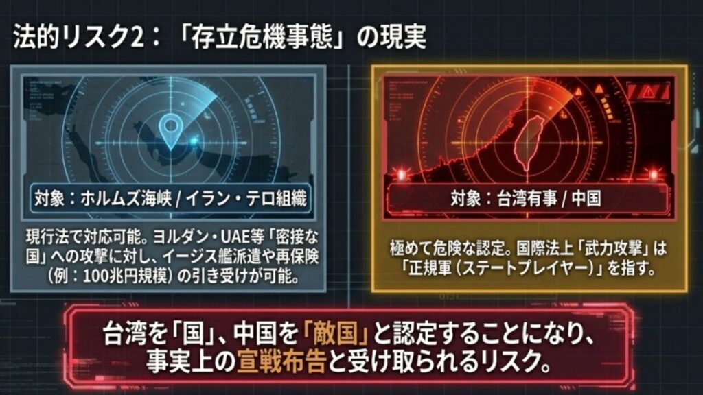 ここで重要なのは、国際法および自衛隊法における「武力攻撃」の定義です。これは「国家」による攻撃を指し、非国家主体によるものは「テロ」と区別されます。高市氏が台湾有事を「存立危機事態」であると踏み込んで発言したことは、台湾を「国家」と認め、その攻撃主体である中国を「敵国」として特定したことに他なりません。
