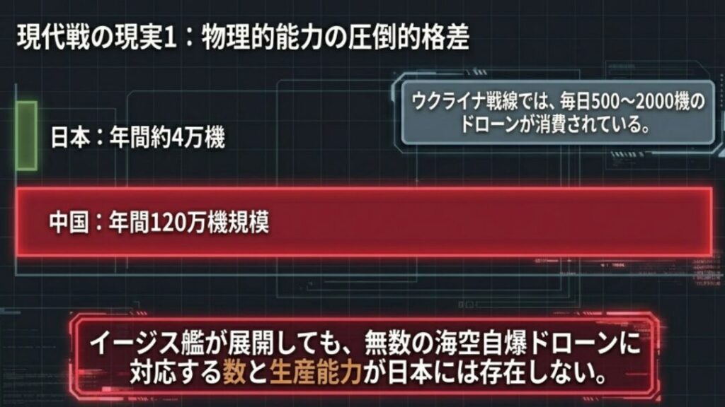 中国が年間120万機を生産できる体制にある一方、日本の目標はわずか4万機。この絶望的な格差を埋めずに法律だけをいじっても、国は守れません。