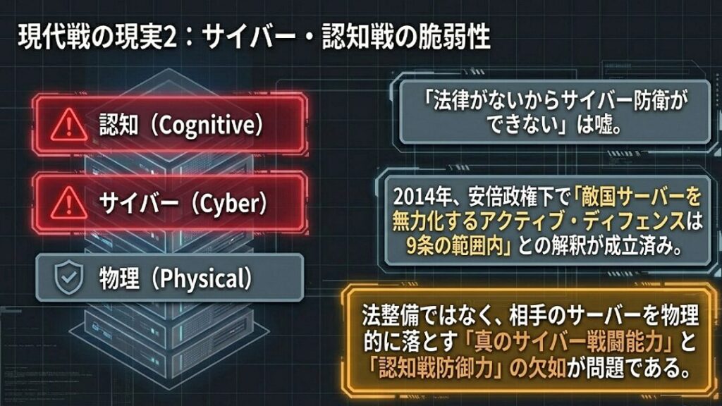 むしろ重要なのは、既存の憲法下で「できること」をやる意志です。例えば、敵のサーバーを停止させる「アクティブ・ディフェンス」について、苫米地氏はかつて安倍晋三元首相や河野克俊統合幕僚長(当時)から、「サイバー空間には国境がなく、サーバー攻撃は公開からのミサイル迎撃と同じ。現行の9条の範囲内で可能である」という直接の言質を得ています。2014年から自衛隊サイバー軍への訓練・協力も行われてきましたが、必要なのは法改正ではなく、こうした物理的な実力と運用の意志なのです。