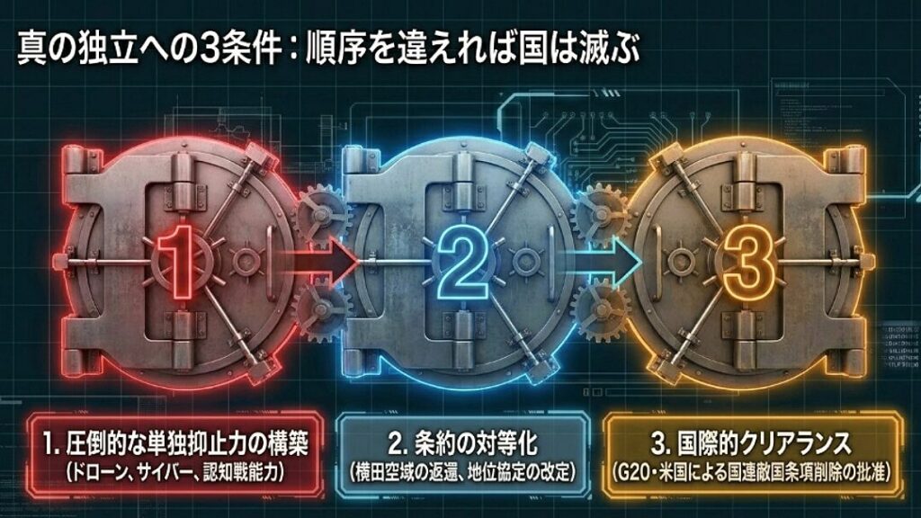 「法改正さえすれば安全が買える」という幻想を捨ててください。物理的な防衛力と、国際法上の正当な主権。この二つを手にしないままの憲法改正は、真の独立ではなく、さらなる隷属への入り口に過ぎないのです