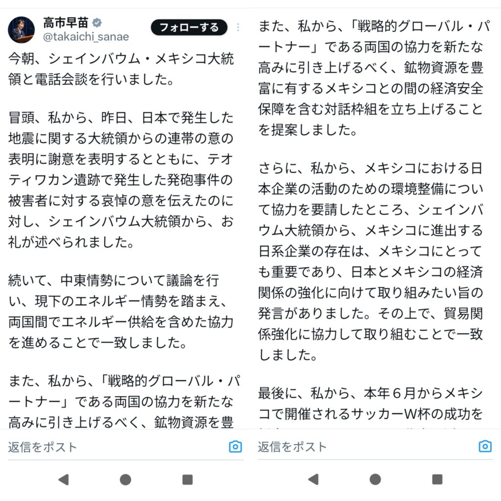 タカイチサナエ総理、パクツイサナエ総理になってしまう。メキシコ大統領との電話会談報告の外務省文書をそのまま、「高市総理大臣から」を「私から」に代えただけで全文投稿していた。自分の言葉でのアレンジを全くしていない。これでは、単なる「パクツイ」である