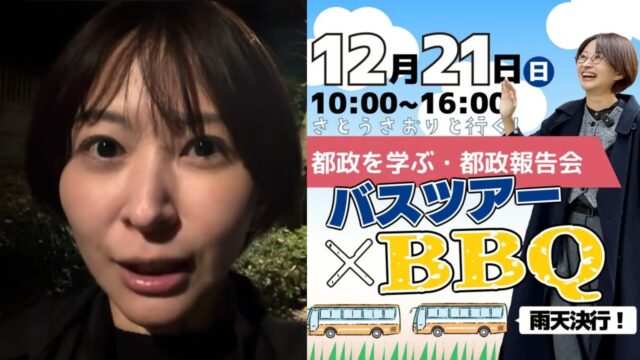 11月23日、さとうさおり氏が自身のYouTubeチャンネルで都政報告会を兼ねたバスツアーとバーベキューイベントの開催を告知しました。イベントは12月21日の日曜日に予定されており、東京から立川市のバーベキュー会場へ移動する日帰り6時間のプ...