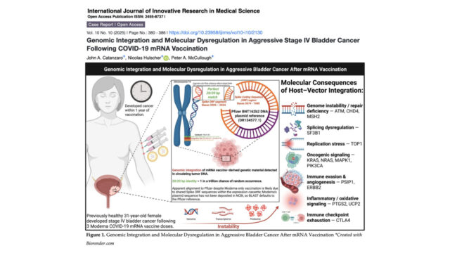 健康 【世界初】研究者が緊急調査を提言、一兆分の一の確率は偶然なのか?新型コロナmRNAワクチン接種後12ヶ月以内にステージIVの膀胱がんを発症した若い女性から、ワクチン由来の遺伝子断片がヒトDNAに組み込まれていた衝撃の発見 世界初となる衝撃的な査読済み研究が発表されました。この研究により、mRNA「ワクチン」のゲノム統合の直接的な分子証拠が発見されました。5つの衝撃的な要点若い女性が進行性の膀胱がんと診断されることは、極めて稀です。そのため、31歳のこれまで健... 2025.10.16 健康
